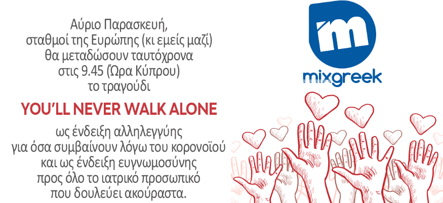 Έπειτα από πρωτοβουλία του Ολλανδού ραδιοφωνικού παραγωγού, Sander Hoogendoorn θα ακουστεί ταυτόχρονα σε όλη την Ευρώπη το τραγούδι «You 'll never walk alone» για να μεταδώσουμε το μήνυμα ότι είμαστε όλοι ενωμένοι ενάντια σε αυτή τη πανδημία που έχει κλονίσει τον κόσμο και στηρίζοντας όλους αυτούς που δουλεύουν για να εξαλειφθεί αυτός ο ιός.